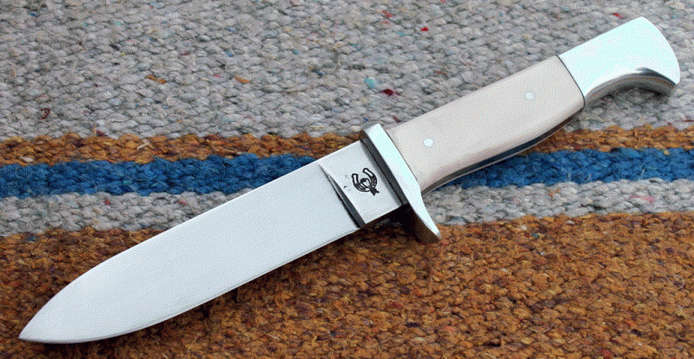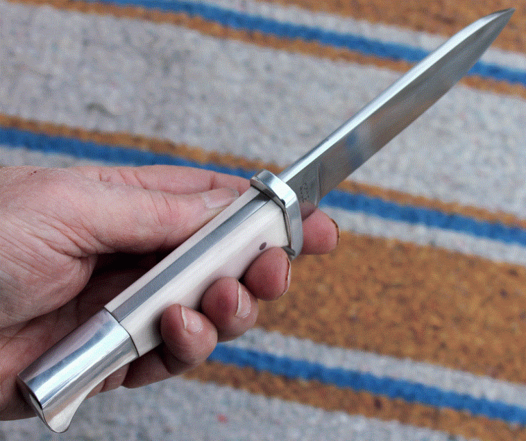 kleines und handliches Fahrtenmesser mit einer waffenrechtskonformen Klinge aus O1 Carbon- Klingenstahl, angelassen auf 61 Rockwell. Die Klinge ist 119 mm lang, 25 mm breit und 4,2 mm stark. Bajonetgriff mit Parierelement und Knauf aus Hartaluminium, Griffschalen aus Elfenbei Ersatz.