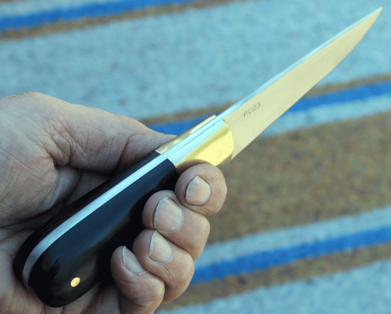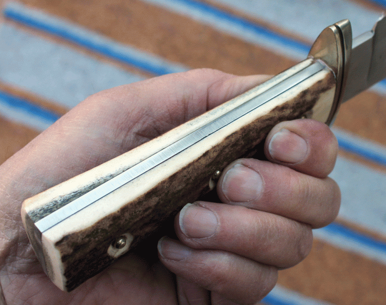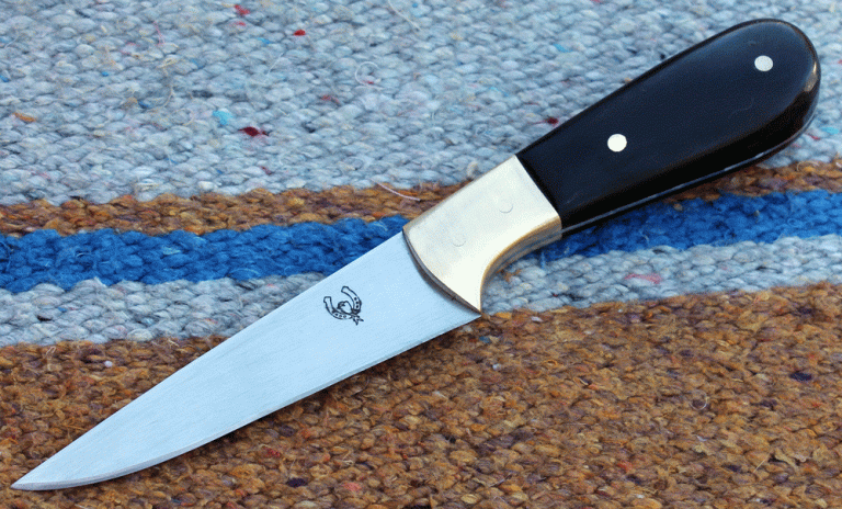 sehr handliches kleines Jagdmesser mit einer Klinge aus O1 Carbon Klingenstahl, 90 mm lang, 25 mm breit und 3 mm stark. Backen aus Messing, Griffschalen aus Rinderhorn.