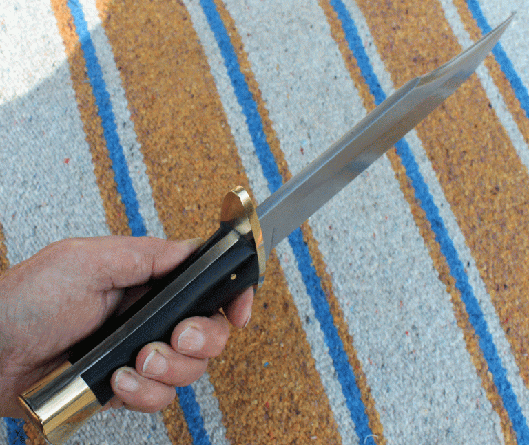 Großes Bowie mit einer Klinge aus Carbon Klingenstahl, 245 mm lang, angelassen auf 61 Rockwell. Parierelement aus Messing, Griffschalen aus Juma black.