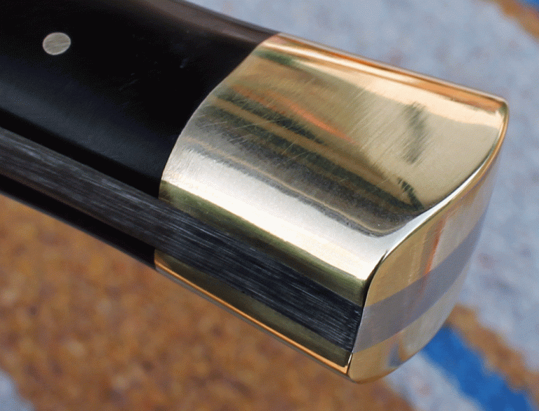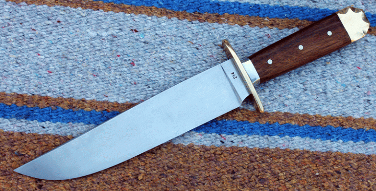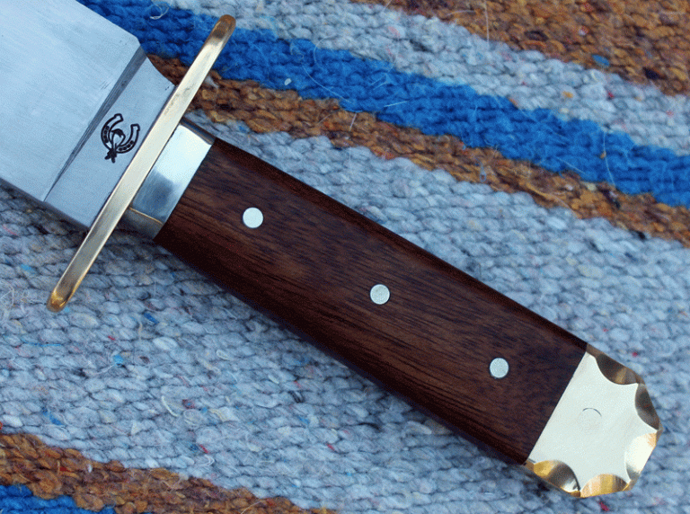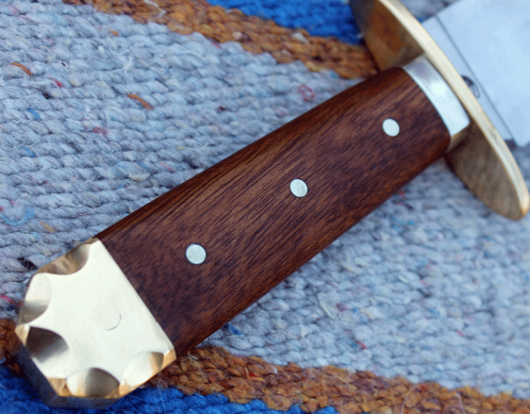 sehr schönes frühes Bowie mit einer Klinge aus O1 Carbon Klingenstahl, angelassen auf 59 Rockwell. Die Klinge ist 200 mm lang, 40 mm breit und am Klingenrücken 6 mm stark. Parierelement und Knauf aus Messing, Zwinge aus Neusilber, Griff aus Amazakoue Hartholz.