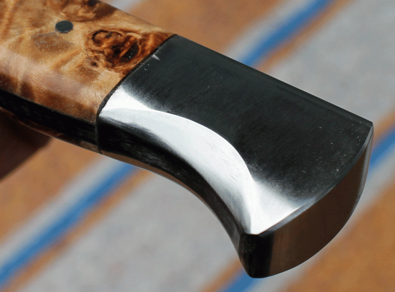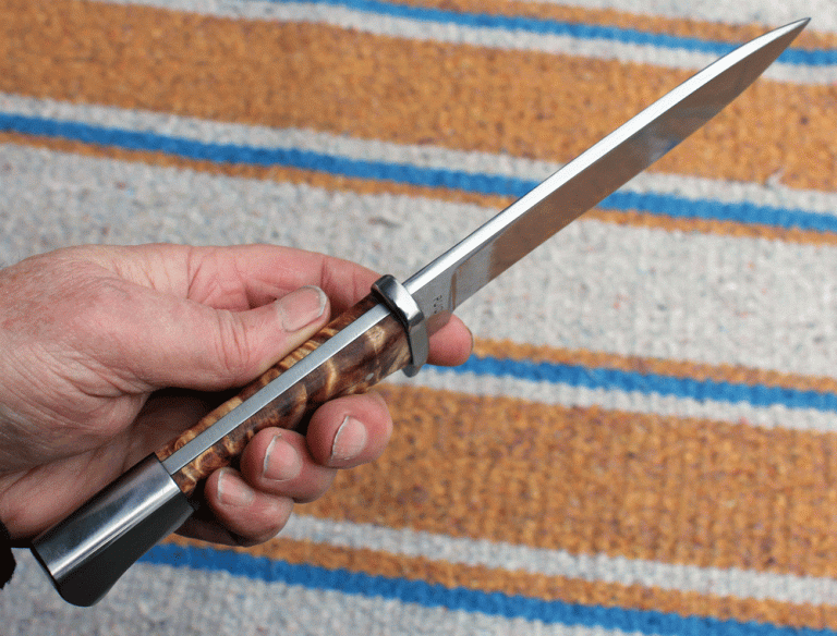 handliches Fahrtenmesser mit einer Klinge aus O1 Carbon Klingenstahl, angelassen auf 61 Rockwell. Die Klinge ist 150 mm lang, 30 mm breit und am Klingenrücken 4,4 mm stark. Handschutz und Knauf aus Edelstahl, Griffschalen aus stabilisiertem Pappel Maserholz.