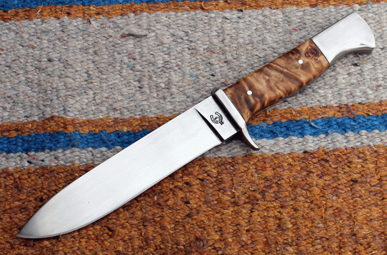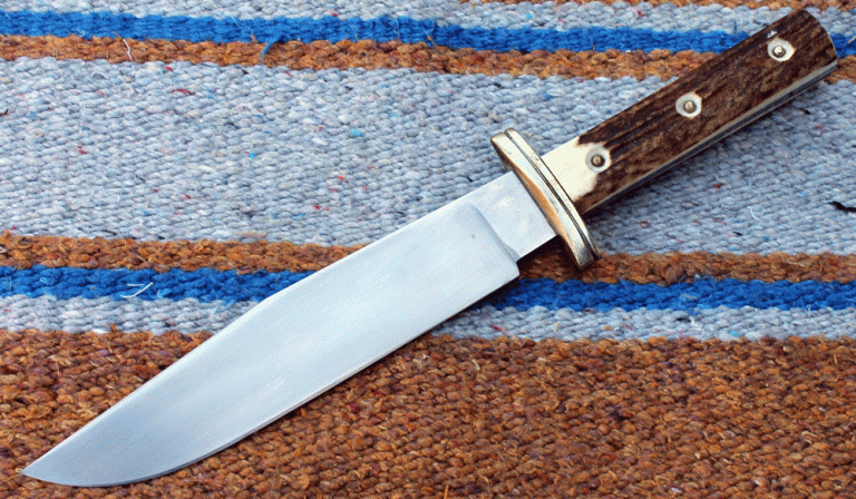 großes, schweres Bowie mit einer Klinge aus O1-Carbon Klingenstahl, angelassen auf 61 Rockwell. Die Klinge ist 250 mm lang, 45 mm breit und 6,2 mm stark. Parierelement und Knauf aus Edelstahl, Griff aus Hirschhorn.