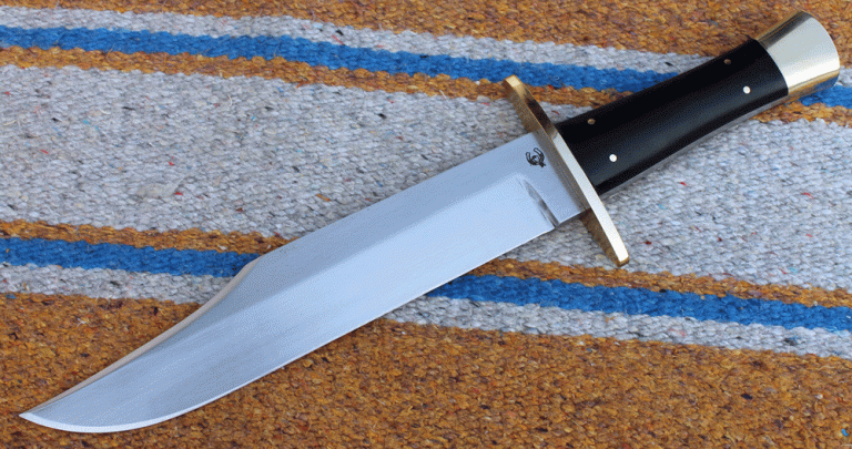 großes Bowie mit einer handgeschmiedeten Klinge aus Carbon Klingenstahl, angelassen auf 60 Rockwell. Die Klinge ist 250 mm lang, 50 mm breit und 6,2 mm stark. Parierelement aus Messing, Griffschalen aus Büffelknochen.